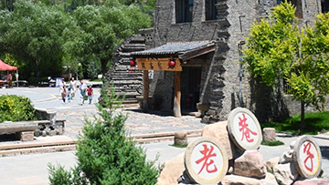 在箭扣长城122号敌台东侧墙体修缮施工现场,工人们结束上午的工作,准备离开去吃午饭(7月2日摄)。