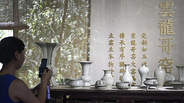 技工杨战杰在箭扣长城120号敌台考古现场观察一片挖出的瓷器残片(7月2日摄)。