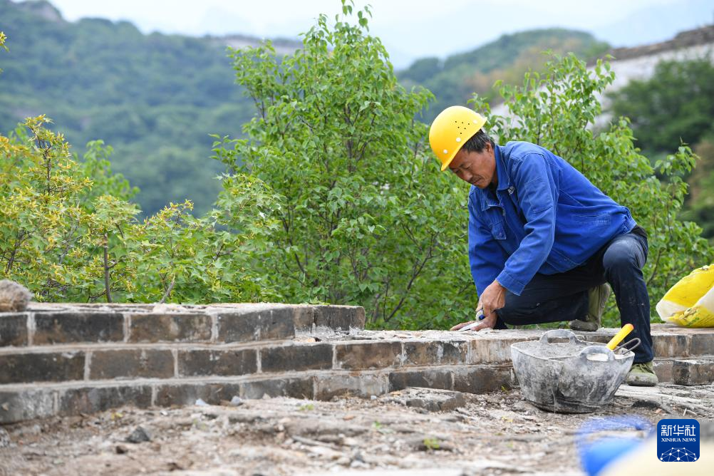 工人在修缮箭扣长城122号敌台东侧墙体垛墙(7月2日摄)。