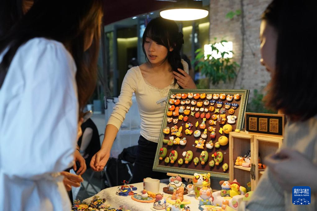 10月17日,一名摊主在陶溪川春秋大集上向游客介绍创意瓷器。