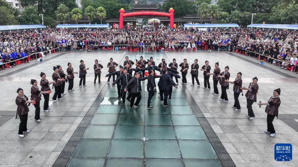 11月9日,侗族群众聚集广西三江侗族自治县多耶广场,跳千人多耶,庆祝侗族传统多耶节(无人机照片)。