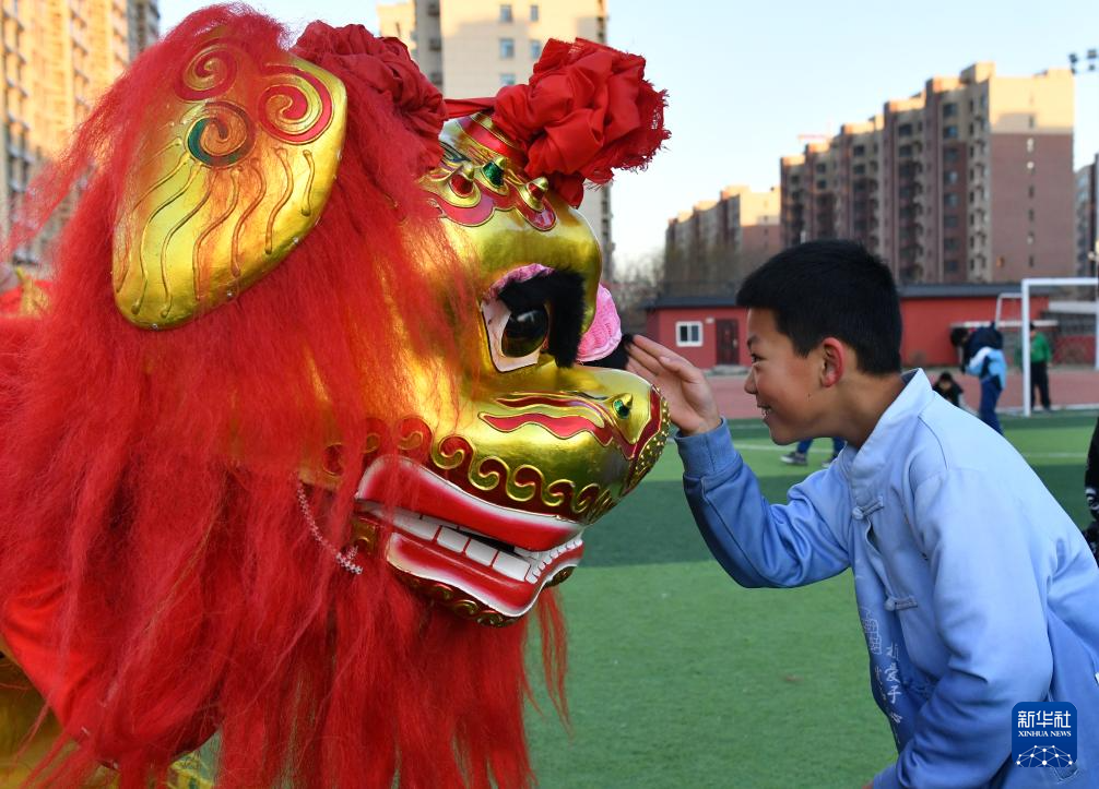 12月20日,河北省沧州市重庆路小学舞龙舞狮社团的学生在与舞狮艺人互动。