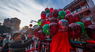 2月11日,迎亲表演队在贵州省锦屏县隆里古城参加“村晚”巡游活动。