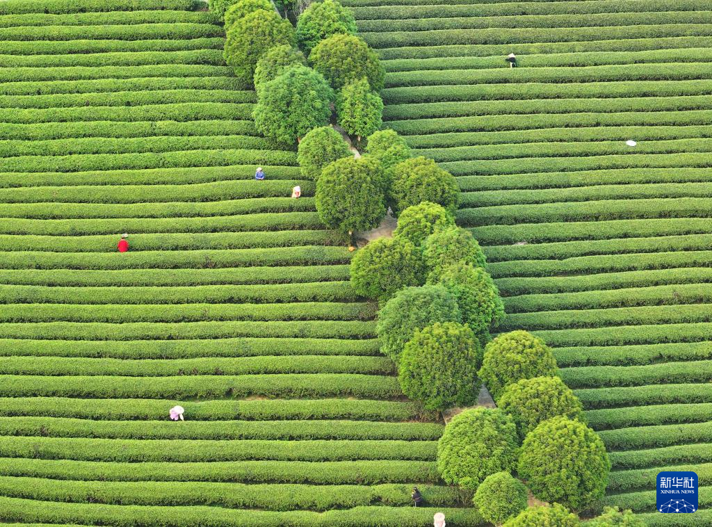4月1日,茶农在江西省宜春市靖安县仁首镇生态茶园内采摘春茶(无人机照片)。
