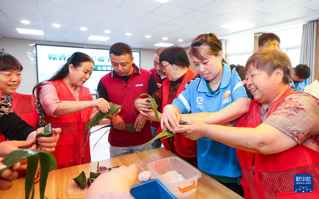 5月23日,江苏省淮安经济技术开发区的退休职工志愿者和快递员一起包粽子。