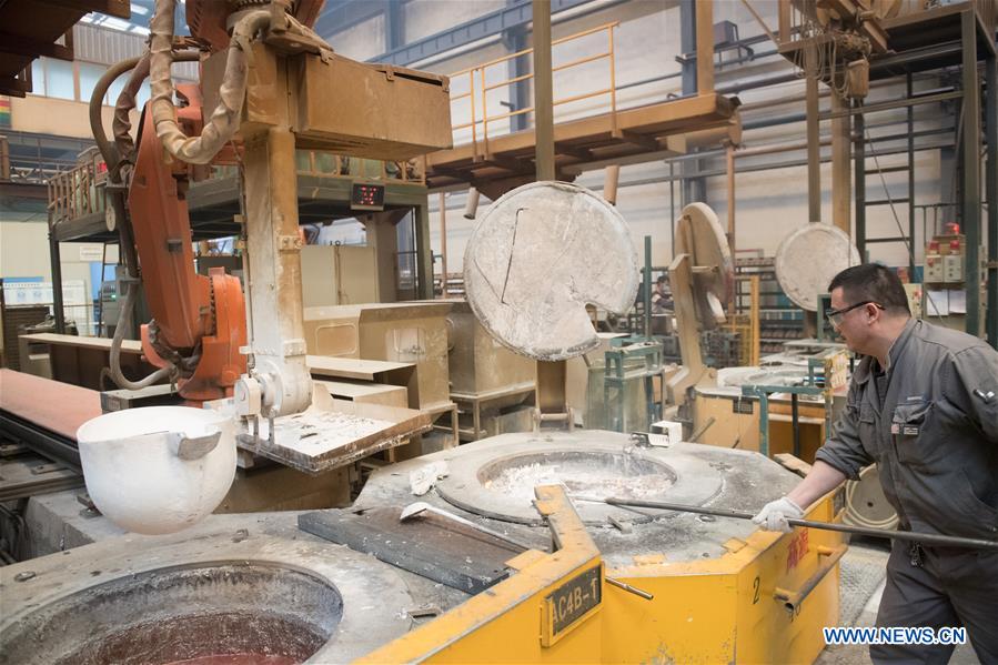 A staff member from Rui'an Ruiming Group operates a robot to make cylinder head in Rui'an City, east China's Zhejiang Province, Jan. 16, 2018. Over 30 enterprises in Rui'an City purchased more than 500 robots to boost productivity. (Xinhua/Weng Xinyang)