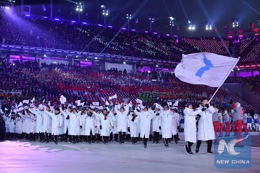 The Democratic People's Republic of Korea (DPRK) and South Korea marched together under a unified Korean flag during the opening ceremony of the 2018 PyeongChang Winter Olympic Games at PyeongChang Olympic Stadium in PyeongChang, South Korea, Feb. 9, 2018. (Xinhua/Lui Siu Wai)