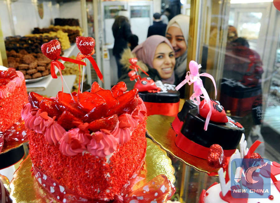 A picture taken on February 13, 2018, in Damascus, capital of Syria, shows red heart-shaped cakes displayed in a shop a day ahead of the Valentines' Day that is marked on February 14 in Syria. The Damascus residents have been suffering from an intensified mortar shells from the rebels in the countryside but the hard war times didn't keep them from observing the love occasion. (Xinhua/Ammar Safarjalani)