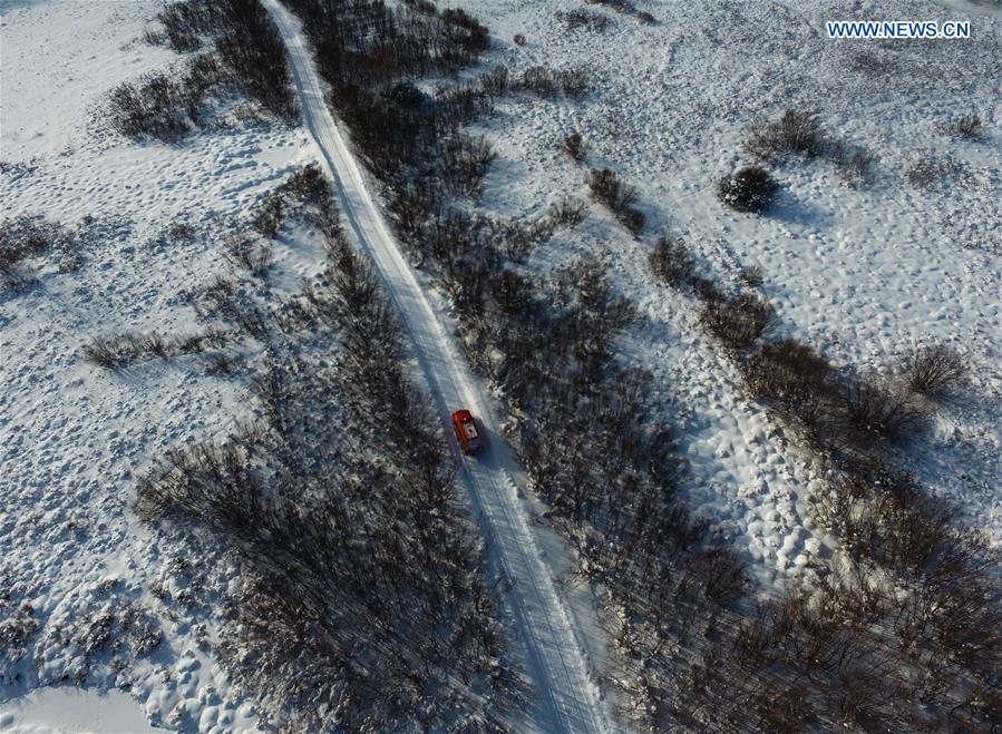 Aerial photo taken on Feb. 14, 2018 shows Bai Yuhua patroling along the forest of Dahinggan Mountains in Arxan City, north China's Inner Mongolia Autonomous Region , Feb. 14, 2018. Bai Yuhua, a forest ranger of Dahinggan Mountains for 28 years, stuck to his post by himeself on the eve of Chinese Lunar New Year for a consecutive 18th year. (Xinhua/Liu Lei)?