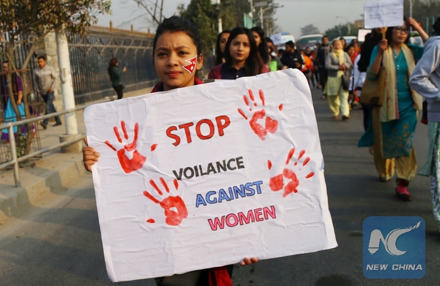A woman holds a placard during a rally marking the International Women's Day with the theme of "Press for Progress" in Kathmandu, Nepal, March 8, 2018. (Xinhua/Sunil Sharma)