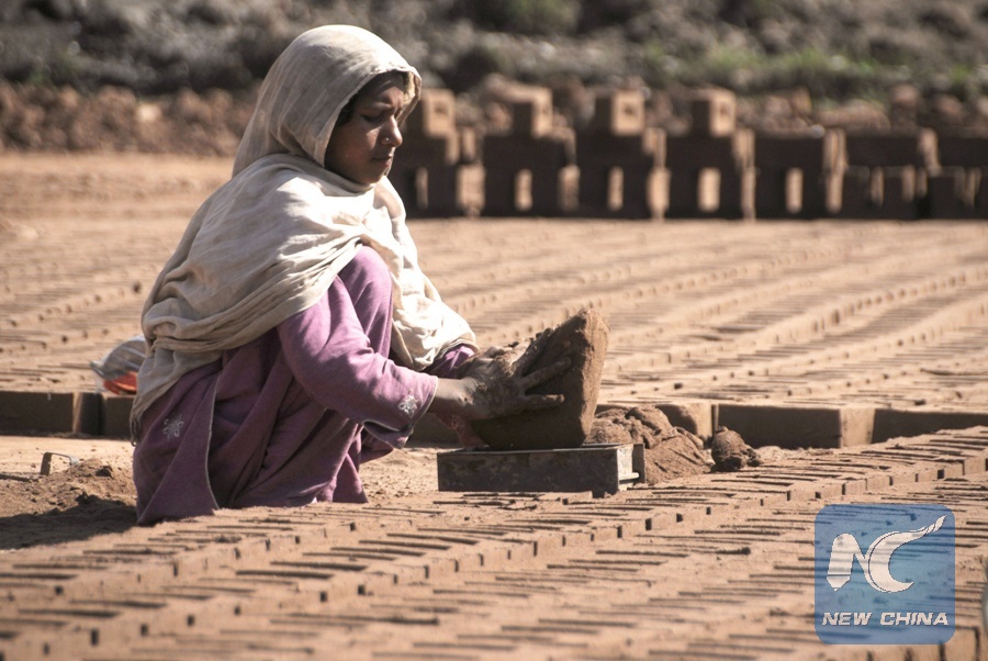 A woman works at a brick factory on the International Women's Day on the outskirts of Rawalpindi, Pakistan on March 8, 2018. (Xinhua/Saadia Seher)