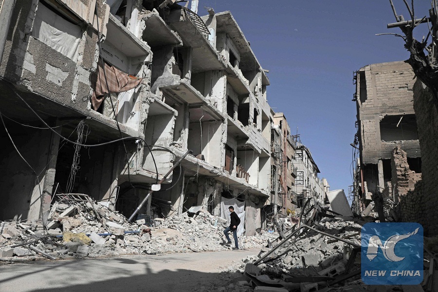 A Syrian man walks down a street past destoyed buildings on March 25, 2018, in Douma, in Eastern Ghouta on the outskirts of the capital Damascus. Nearly 2,000 Syrian rebels and civilians began leaving a ravaged pocket of Eastern Ghouta on Matrch 25, in fresh evacuations that further emptied the former rebel bastion. (AFP Photo)