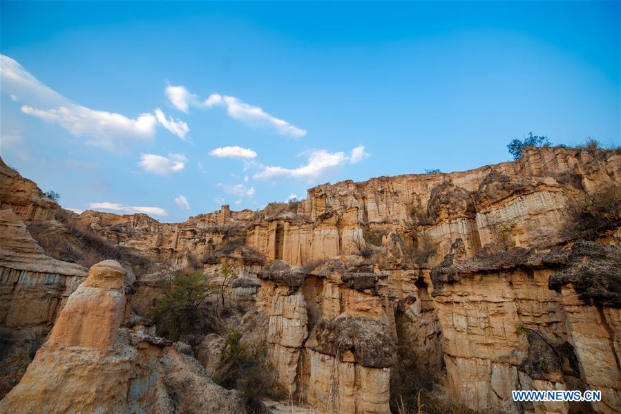 Photo taken on April 4, 2018 shows the scenery of earth forest in Yuanmou County, southwest China's Yunnan Province. The earth forest is basically in color of yellow and the color varies in different part. It was formed by geological movement and soil erosion. (Xinhua/Hu Chao)