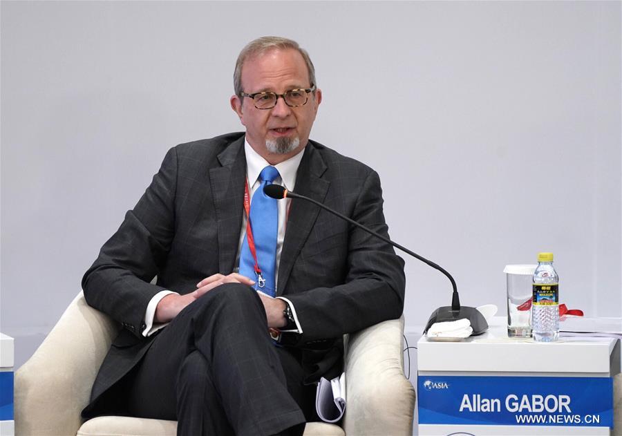 E. Allan Gabor, managing director and country speaker of Merck Holding (China) Co. Ltd and general manager of Merck Performance Materials in China, speaks at the session of "The Future of Production" during the Boao Forum for Asia Annual Conference 2018 in Boao, south China's Hainan Province, April 9, 2018. (Xinhua/Xing Guangli)