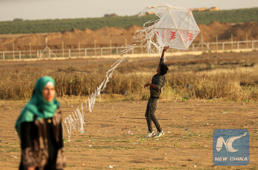 Spokesman for the organizing committee of the protests, Ahmed Abu Retaima, told Xinhua that flying kites is an initiative of young people who wanted to show that the protests are peaceful but are met by violent Israeli reactions.
