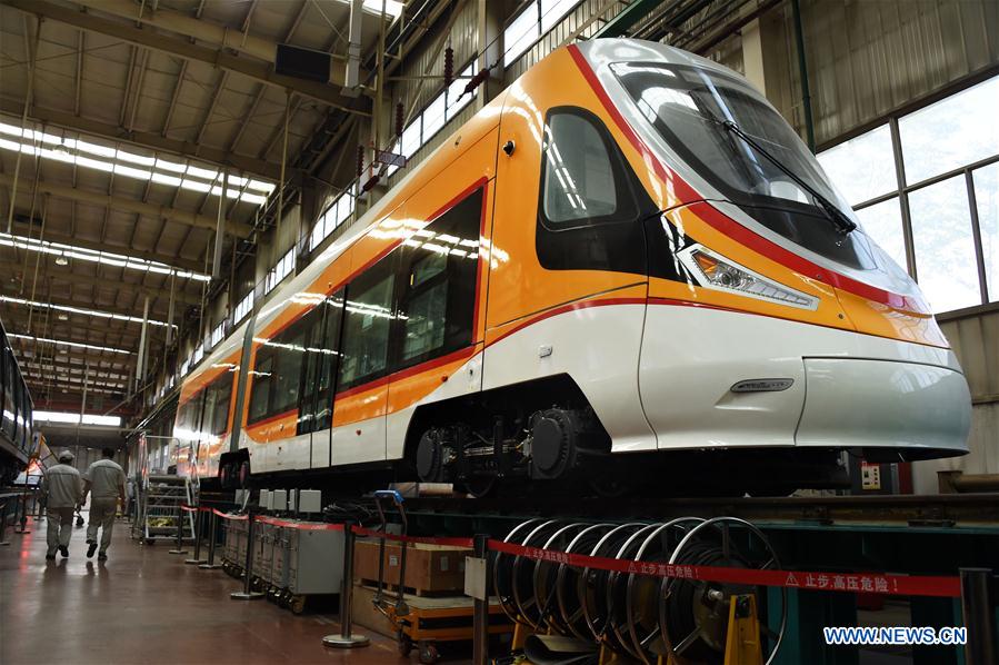 Technicians check a tram designed for high-altitude region at the CRRC Qingdao Sifang Co. in Qingdao, a coastal city in east China's Shandong Province, May 10, 2018. China's first tram that will be used on Qinghai-Tibet Plateau rolled off the production line on May 9 in Qingdao. With a maximum speed of 70 kilometers per hour, the two-carriage tram is capable of carrying 168 passengers. The tram line is expected to be put into operation in Delingha, capital of the Haixi Mongol and Tibetan Autonomous Prefecture in Qinghai Province, this year. (Xinhua/Li Ziheng)