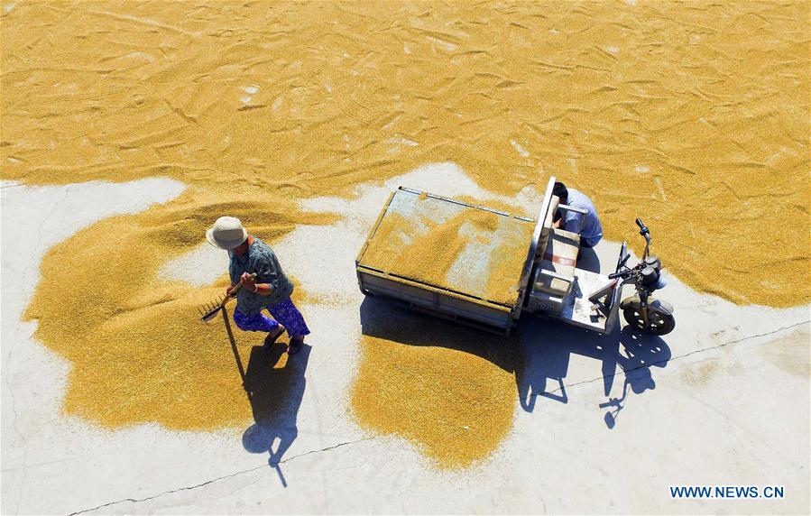 Farmers dry wheat in the sun in Dongxinzhuang Town of Zunhua City, north China's Hebei Province, June 19, 2018. (Xinhua/Liu Mancang)