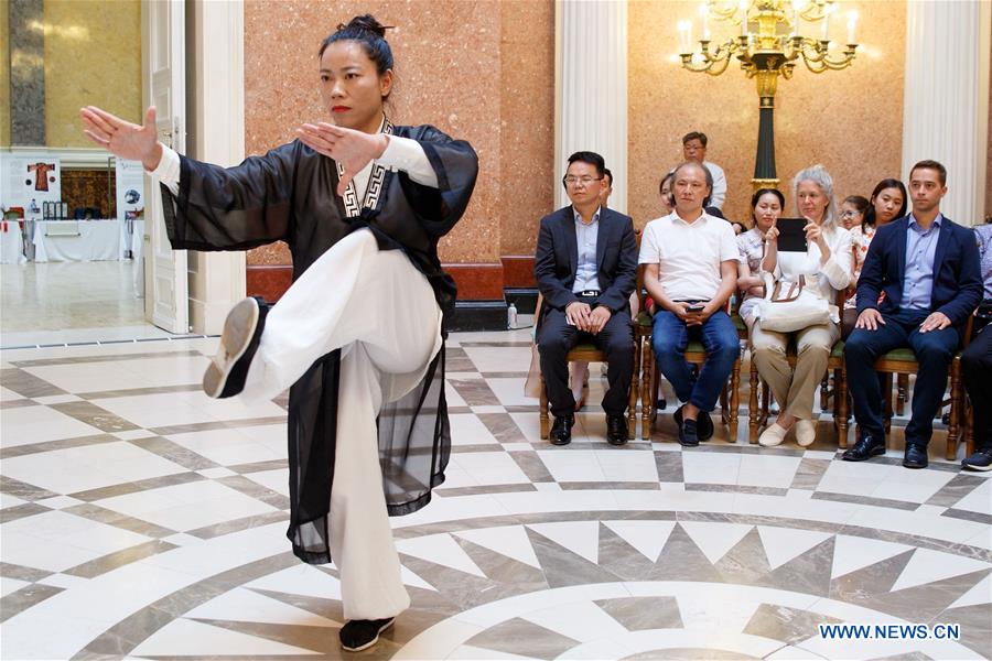 A woman performs Wudang Tai Chi during a cultural exhibition at the Hungarian National Museum in Budapest, Hungary on July 5, 2018. A cultural exhibition featuring the intangible cultural heritage of China, concentrating on the region of the Yangtze River and Hubei province opened here on Thursday at the Hungarian National Museum in the presence of the Chinese ambassador and a former Hungarian Prime Minister. (Xinhua/Szilard Voros)
