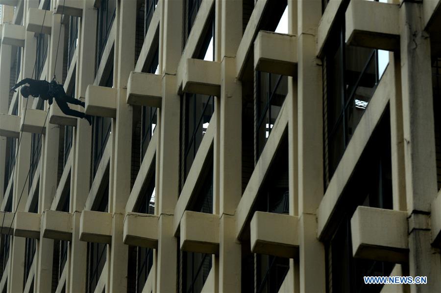 An anti-terror drill is held in Jakarta Aug. 1, 2018, as part of the security measures for the Asian Games 2018 due to be held in Indonesia from Aug. 18 to Sept. 2. (Xinhua/Agung Kuncahya B.)