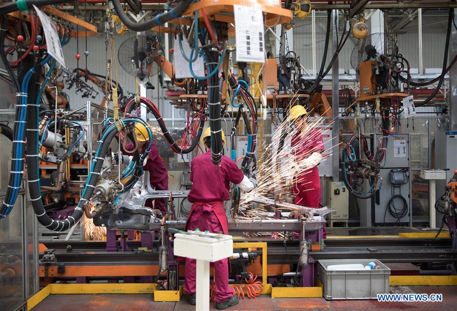 Staff members work on a production line of new energy vehicles at a JAC Motors factory in Tongling City, east China's Anhui Province, Aug. 7, 2018. Tongling government takes measures to improve ecological environment and develop green industry along the Yangtze River. (Xinhua/Jin Liwang)