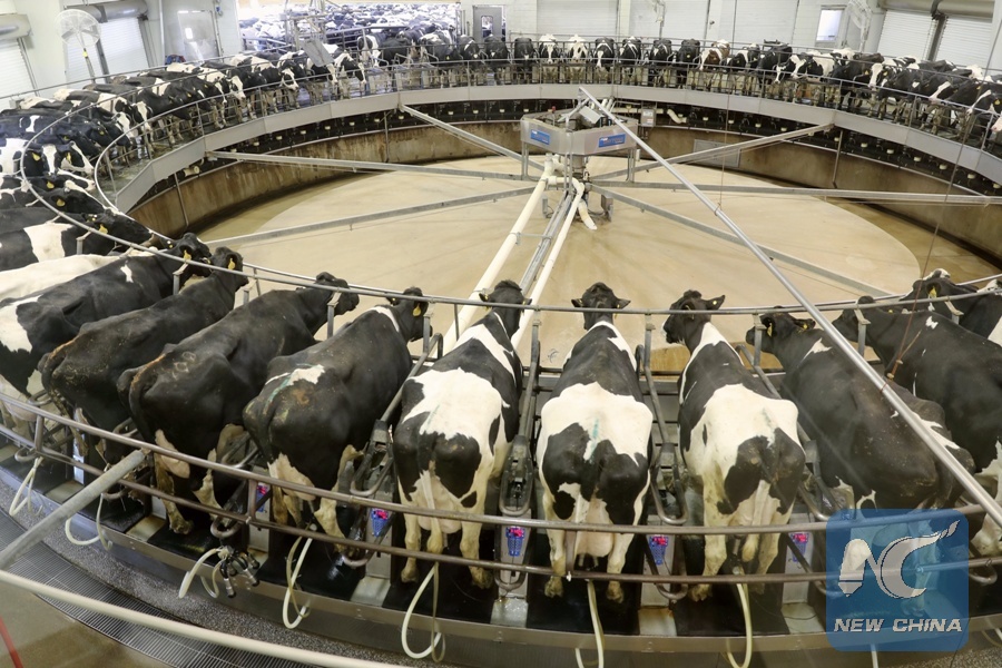 Photo taken on March 23, 2018 shows the automatic milking equipment and cows to be milked at Fair Oaks Farms in Fair Oaks, Indiana, the United States.(Xinhua/Wang Ping)