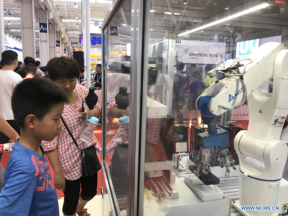 Visitors look at a robot at the 2018 World Robot Conference in Beijing, Aug. 17, 2018. The conference attracts a total of 166 domestic and international enterprises exhibiting their cutting edge technologies and more than 500 items are displayed at the scene. (Xinhuanet/Liang Yurou)