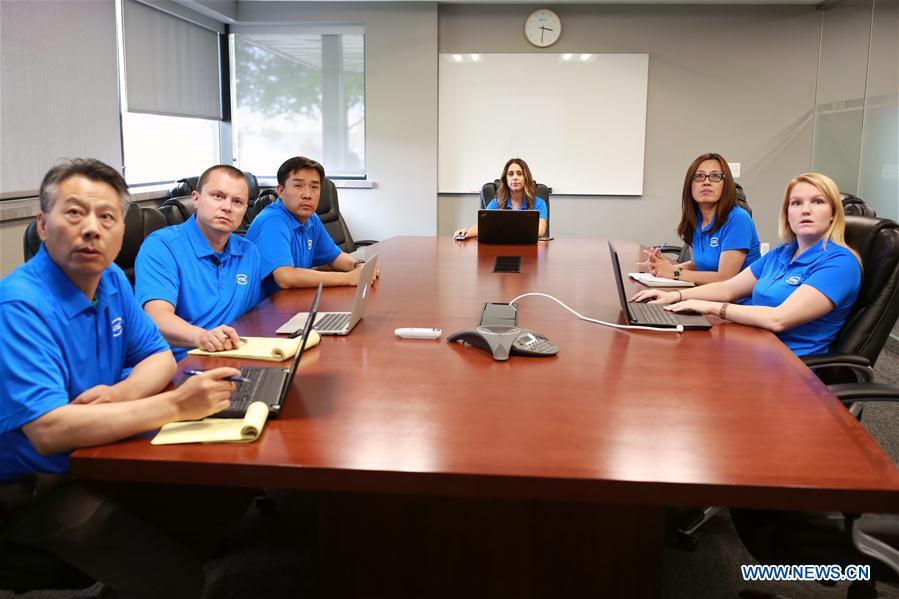 Employees of STEC USA have meeting in office of factory in suburb Detroit, Michigan, the United States, on Aug. 15, 2018. (Xinhua/Wang Ping)