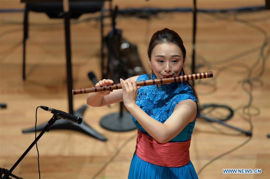 Musician Zhao Yunmeng plays the bamboo flute during a concert given by the Shanghai Chinese Orchestra in Mexico City, Mexico, on Oct. 14, 2018. (Xinhua/Xin Yuewei)