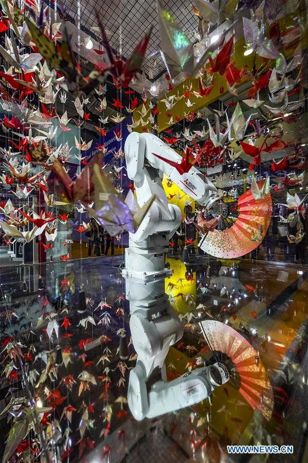 A robot dances with a fan at the booth of Mitsubishi during the first China International Import Expo(CIIE) in Shanghai, east China, Nov. 10. 2018. The CIIE concluded here on Saturday. (Xinhua/Shen Bohan)