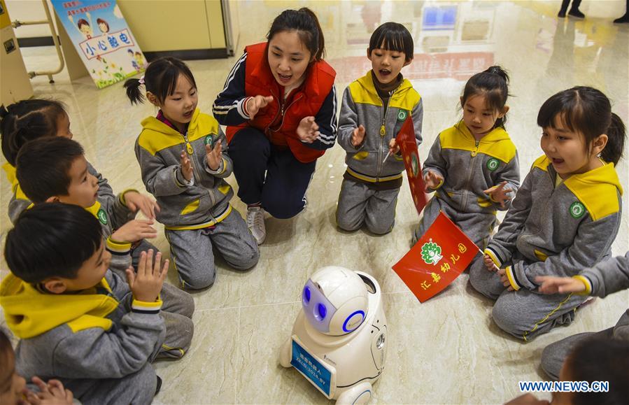 Children from a kindergarten interact with a robot at a mobile science and technology museum in Shenzhou, north China's Hebei Province, Nov. 10, 2018. (Xinhua/Li Xiaoguo)