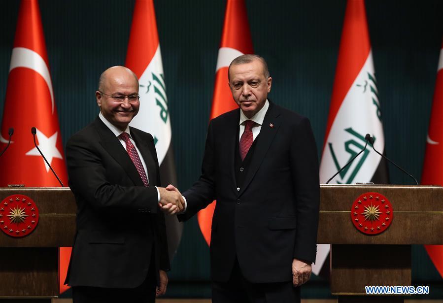 Turkish President Recep Tayyip Erdogan (R) and his Iraqi counterpart Barham Salih shake hands during a joint press conference at the Presidential Palace in Ankara, Turkey, on Jan. 3, 2019. Turkey and Iraq would enhance their cooperation in the fight against terrorism, Turkish President Recep Tayyip Erdogan said on Thursday. (Xinhua/Mustafa Kaya)