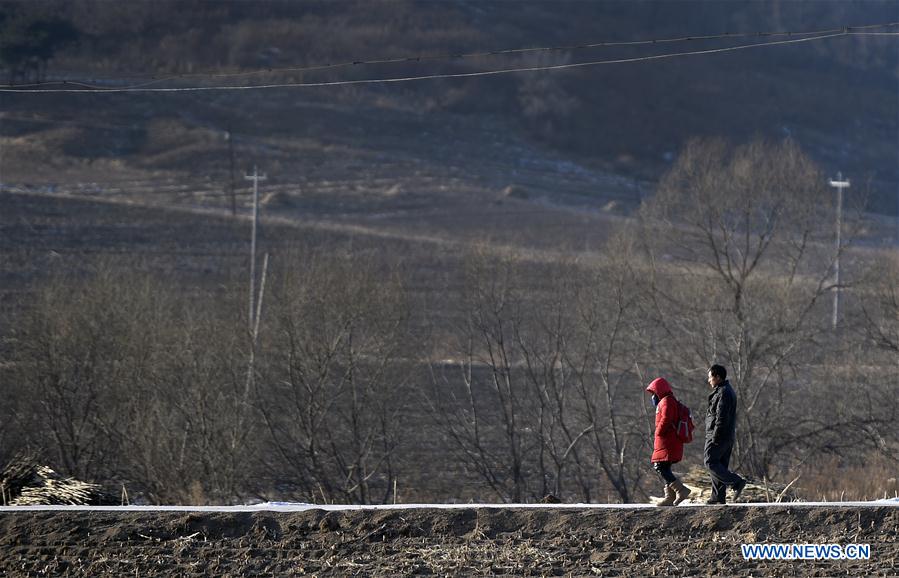 Hu Zhisheng walks his student Sun Xiaofeng way home after school in Yantai Village of Lianhua Township in Tieling City, northeast China's Liaoning Province, Jan. 7, 2019. Located in a remoted mountain village, most students of Yantai school had transferred to other places outside the mountain. Sun Xiaofeng, a third grade student, became the only student of the school in September last year taught by Hu Zhisheng, the only one faculty of Yantai primary school. (Xinhua/Yao Jianfeng)