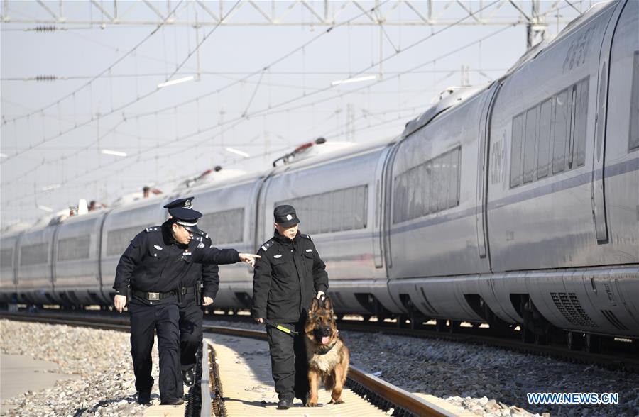 Railway policemen work to ensure safety for Spring Festival travel rush in Beijing