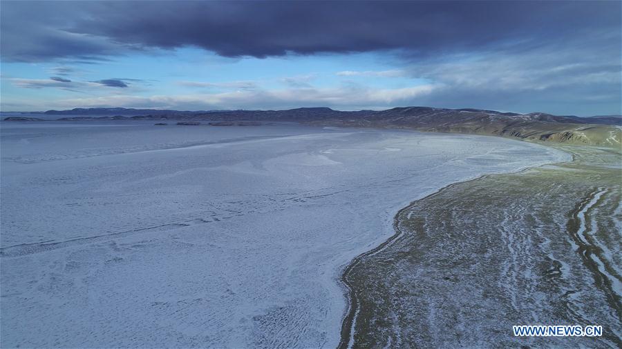 Photo taken on Jan. 18, 2019 shows the frozen Namtso Lake in southwest China's Tibet Autonomous Region. In the past, herdsmen in Tibet endured a ridiculously long, cold winter from October to the end of June, before moving to the summer meadow. They had no fixed residence and migrated when the seasons changed, taking their tents, kitchen utensils and other necessities on horseback. Nowadays, most herdsmen benefit from local resettlement program. They said goodbye to their winter hovels and moved into brick-and-mortar Tibetan-style homes. (Xinhua/Purbu Zhaxi)