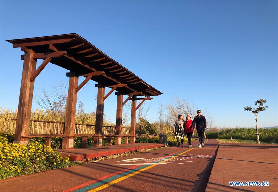 People walk at the Haidong wetland park in Dianchi Lake, the largest fresh water lake on the Yunnan-Guizhou Plateau, in Kunming, capital of southwest China's Yunnan Province, Feb. 2, 2019. (Xinhua/Qin Qing)