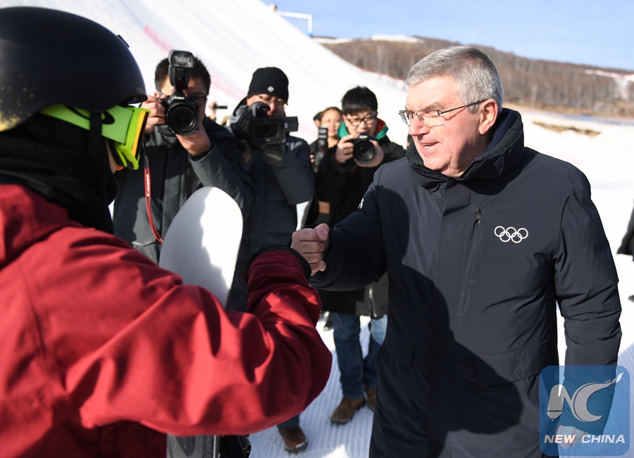 IOC president Thomas Bach inspected several of the 2022 Winter Games' venues in Zhangjiakou and Yanqing on Jan. 29. (Xinhua/Zhang Chenlin)
