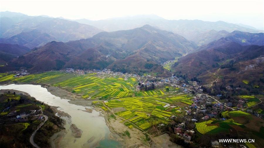 Aerial photo taken on March 17, 2019 shows cole flower fields in Yanzibian Township of Ningqiang County in Hanzhong, northwest China's Shaanxi Province. The blossom of the flowers heralds the arrival of spring. (Xinhua/Liu Xiao)