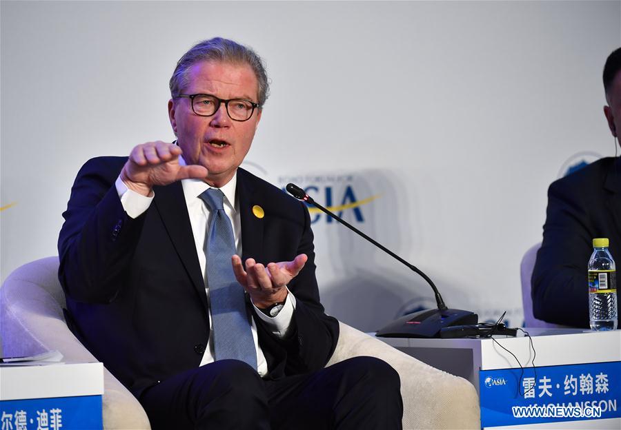 Leif Johansson, chairman of the board of AstraZeneca, speaks at the session of "The Era of 'AI+'" during the Boao Forum for Asia annual conference in Boao, south China's Hainan Province, March 27, 2019. (Xinhua/Guo Cheng)