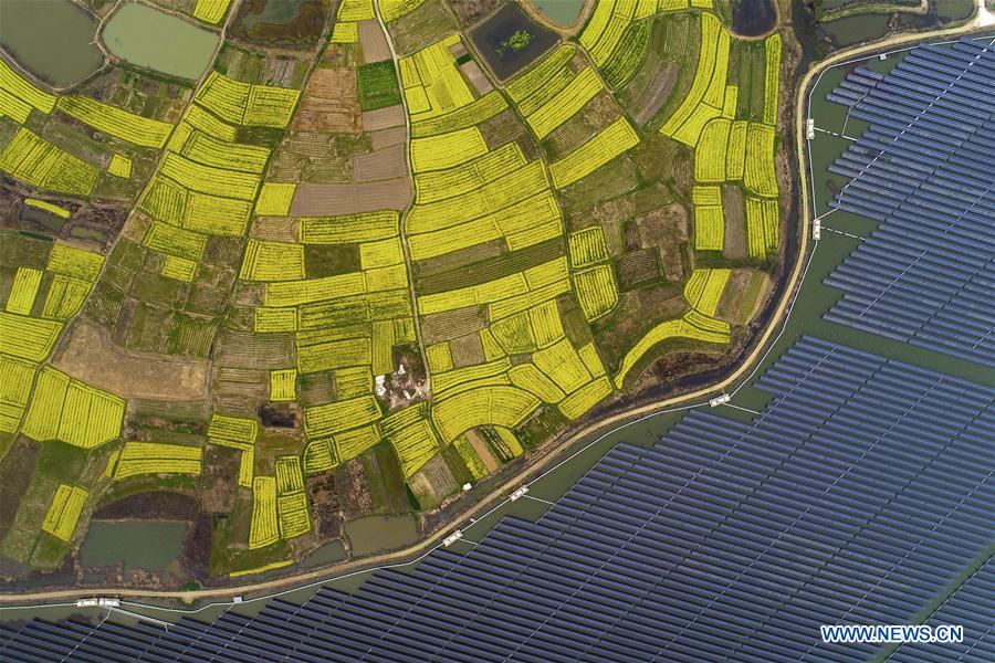 Aerial photo taken on March 28, 2019 shows fields of cole flowers at the Xinhe Community of Liangyuan Township in Hefei, capital of east China's Anhui Province. (Xinhua/Zhang Dagang)