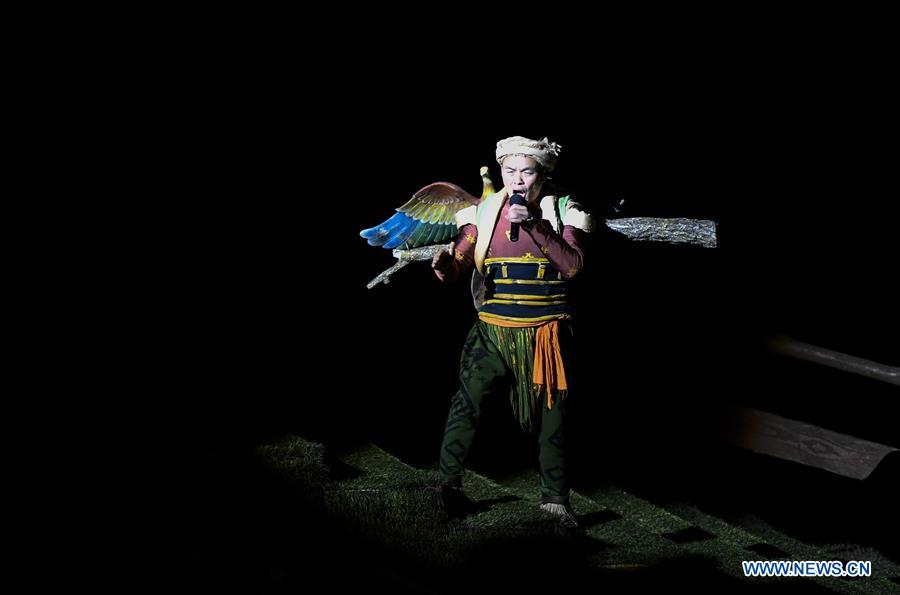 Yang Xingyong performs Chuanjiang Haozi, work songs of boat trackers, during the real-scene show Impression Wulong at a tourist scenic spot in Wulong District of southwest China's Chongqing, March 26, 2019. Yang Xingyong, a 48-year-old farmer from Banqiao Village of Baima Town in Wulong District of Chongqing, has staged over 2,000 performances in the Impression Wulong, a well-known 70-minute-long show that depicts the landscape and culture of southwest China. His excellence in performing Chuanjiang Haozi, work songs of boat trackers in Chongqing, has earned him not only fame, but also a prosperous life. In recent years, Wulong District has been committed to developing tourism industry, as a way to attract talents and capital, and boost people's income. The tourism sector has become a major source of income for about 100,000 people in the district. (Xinhua/Liu Chan)