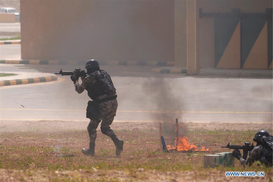 Soldiers of the Jordan Armed Forces (JAF) perform an anti-terror drill on the opening ceremony of the 11th annual Warrior Competition at the King Abdullah II Special Operations Training Center (KASOTC) in Amman, Jordan, April 14, 2019. (Xinhua/Lin Xiaowei)