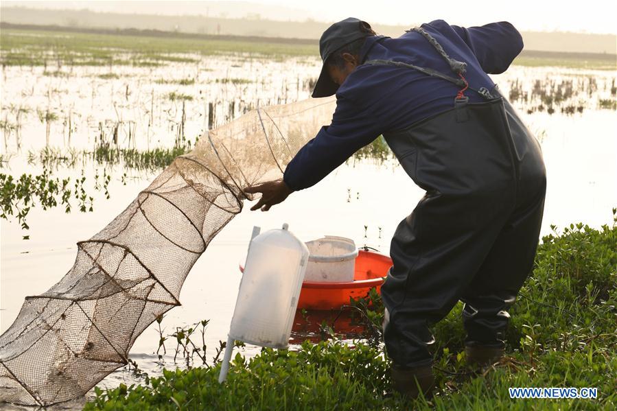 A farmer catches crayfish at a mixed farm in Huanglu Town of Chaohu City, east China's Anhui Province, May 1, 2019. People from various sectors stick to their posts during the Labor Day holiday. (Xinhua/Zhang Duan)