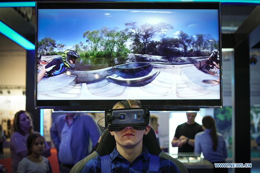 A man takes part in a virtual reality immersion demonstration at the Electronics Show in Warsaw, Poland, on May 12, 2019. The Electronics Show in Warsaw, one of the biggest consumer electronics and new technology trade show in Poland, was held here with over 350 exhibitors from across the world. (Xinhua/Jaap Arriens)