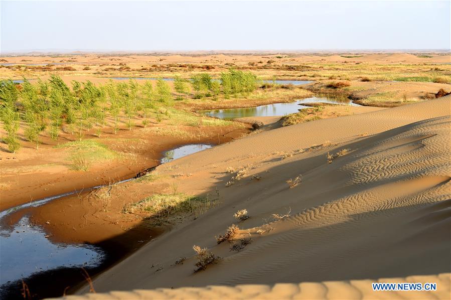 Photo taken on May 9, 2019 shows a landscape of Kubuqi Desert formed by water of the Yellow River in ice flood period in Hangjin Banner, north China's Inner Mongolia Autonomous Region. Inner Mongolia Autonomous Region lies at the forefront of China's fight against desertification. The region's afforestation efforts will consolidate its role as an important ecological barrier protecting northern China. Afforestation of Kubuqi Desert has reached 3,200 square kilometres in recent years which changed the environment tremendously. In 2014, The United Nations Environment Program (UNEP) announced that Kubuqi Desert is an ecological economy demonstration zone. (Xinhua/Ren Junchuan)