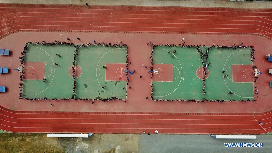 An aerial photo shows students practise wrestling in the elementary school of Shuangjiang Township, Liping County, Miao-Dong Autonomous Prefecture of Qiandongnan, southwest China's Guizhou Province, April 17, 2019. Wu You has been practising traditional wrestling of Dong ethnic group coached by his father Wu Fagui, a former champion of traditional wrestling competition. In April, he competed as the youngest player of Sizhai Village in the annual Wrestling Festival. Wu You's father Wu Fagui was also coached by his father Wu Zhiji when he was a child. Like Wu's family, the traditional wrestling of Dong ethnic group has been passed from generation to generation for nearly 400 years. Every year around the 15th day of the third month in Chinese lunar calendar, people around the area dress up in traditional costumes to celebrate Wrestling Festival. (Xinhua/Ou Dongqu)