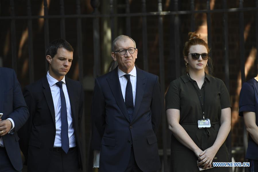 British Prime Minister Theresa May's husband Philip May (C) listens to Theresa May's speech outside 10 Downing Street in London, Britain on May 24, 2019. Theresa May said on Friday that she will quit as leader of the Conservative party on June 7, paving the way for the process of electing her successor. (Xinhua/Alberto Pezzali)