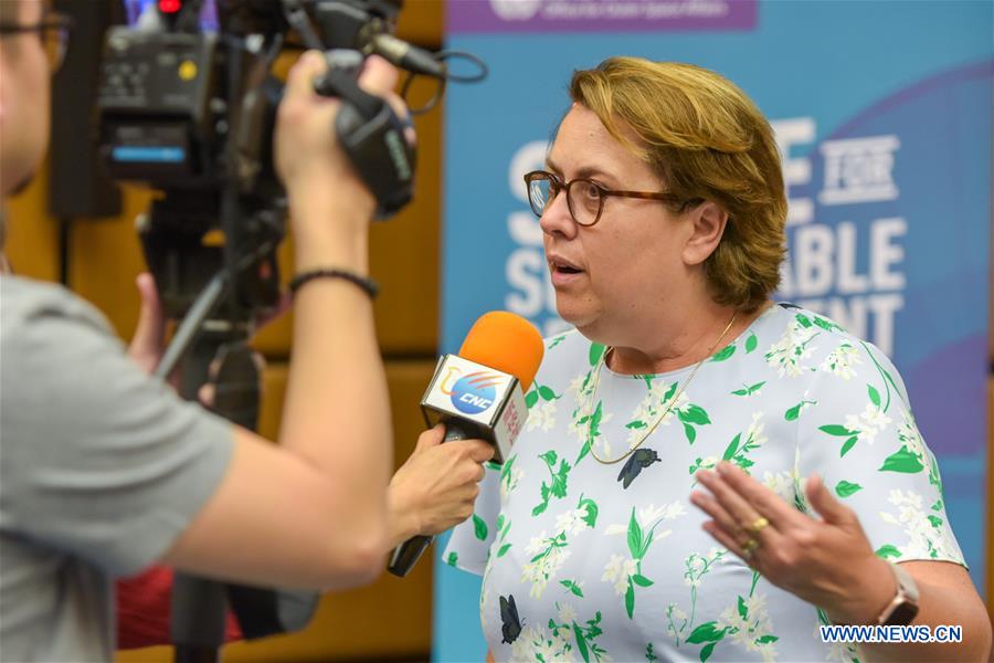 Simonetta Di Pippo, Director of the United Nations Office for Outer Space Affairs, is interviewed by Xinhua during the Chinese navigation exhibition "From Compass to BeiDou" in Vienna, Austria, on June 11, 2019. A Chinese navigation exhibition opens in Vienna International Center on Tuesday, showing how the nation evolves "from compass to BeiDou" - as the exhibition is themed - in time service, surveying, mapping and navigation technologies. (Xinhua/Guo Chen)