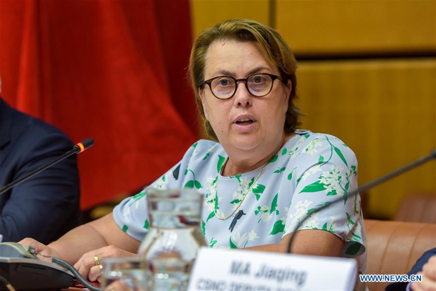 Simonetta Di Pippo, Director of the United Nations Office for Outer Space Affairs, addresses the opening ceremony of the Chinese navigation exhibition "From Compass to BeiDou" in Vienna, Austria, on June 11, 2019. A Chinese navigation exhibition opens in Vienna International Center on Tuesday, showing how the nation evolves "from compass to BeiDou" - as the exhibition is themed - in time service, surveying, mapping and navigation technologies. (Xinhua/Guo Chen)