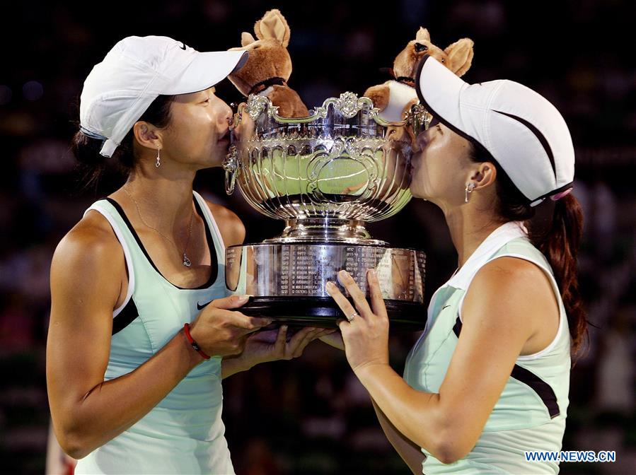 Zheng Jie (R) and Yan Zi kiss the trophy of the women's doubles champion at the Australian Open tennis tournament in Melbourne Jan. 27, 2006. This year marks the 70th anniversary of the founding of the People's Republic of China (PRC). On April 5, 1959, Rong Guotuan won the champion of the men's singles event at the 25th ITTF World Table Tennis Championships in Dortmund, Germany, becoming China's first ever world champion. Chinese players have made more achievements during the 60 years since then. (Xinhua)