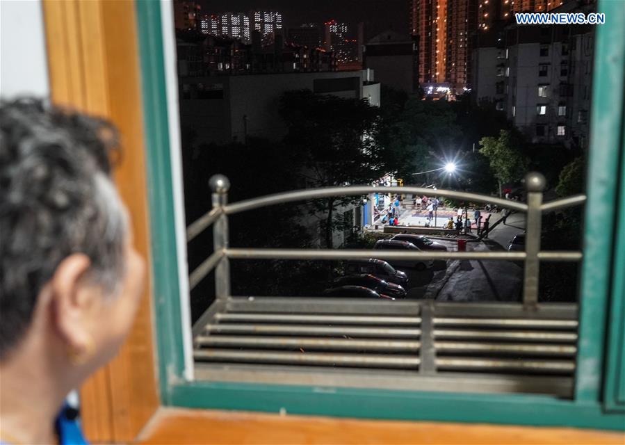 Photo taken on June 4, 2019 shows 78-year-old Sun Yuping watching people doing the Shisuo exercises through the window at her home in Nanjing, east China's Jiangsu Province. She joined a Shisuo team five years ago and gained not only a stronger body but lots of friends. Shisuo (stone lock), a stone dumbbell in the form of ancient padlock, is usually seen in the traditional Chinese workout routine. With hundreds of workout moves, Shisuo exercise can not only enhance strength, but also help people to coordinate hands, eyes and the body. Shisuo dates back to the Tang Dynasty in which soldiers first used it to build their bodies. The Shisuo exercise has a long history in Nanjing, east China's Jiangsu Province. Endearing itself to the public in recent years, Shisuo becomes a national fitness activity. Nearly 20 Shisuo teams are formed for regular activities and competitions. (Xinhua/Yang Lei)
